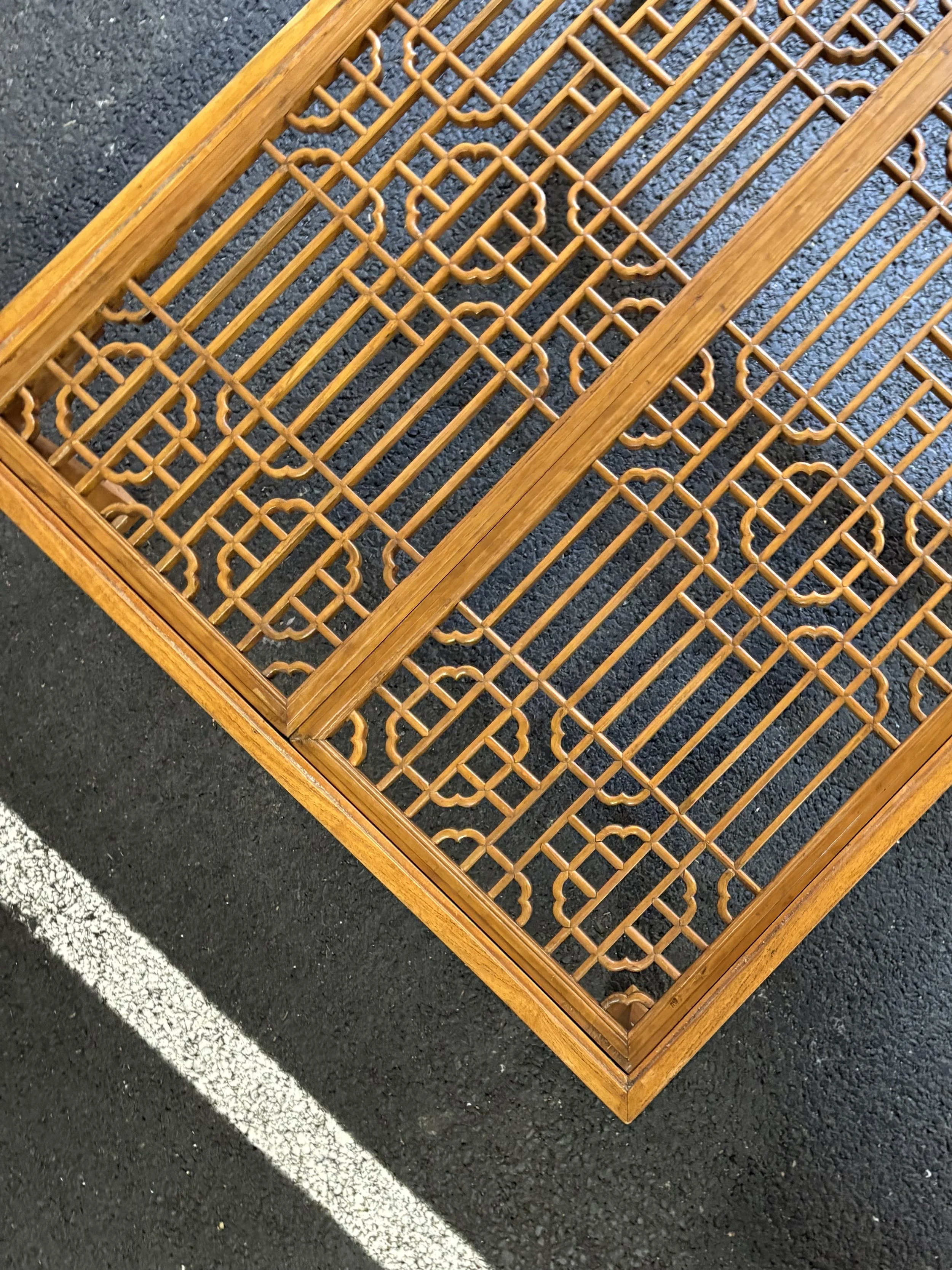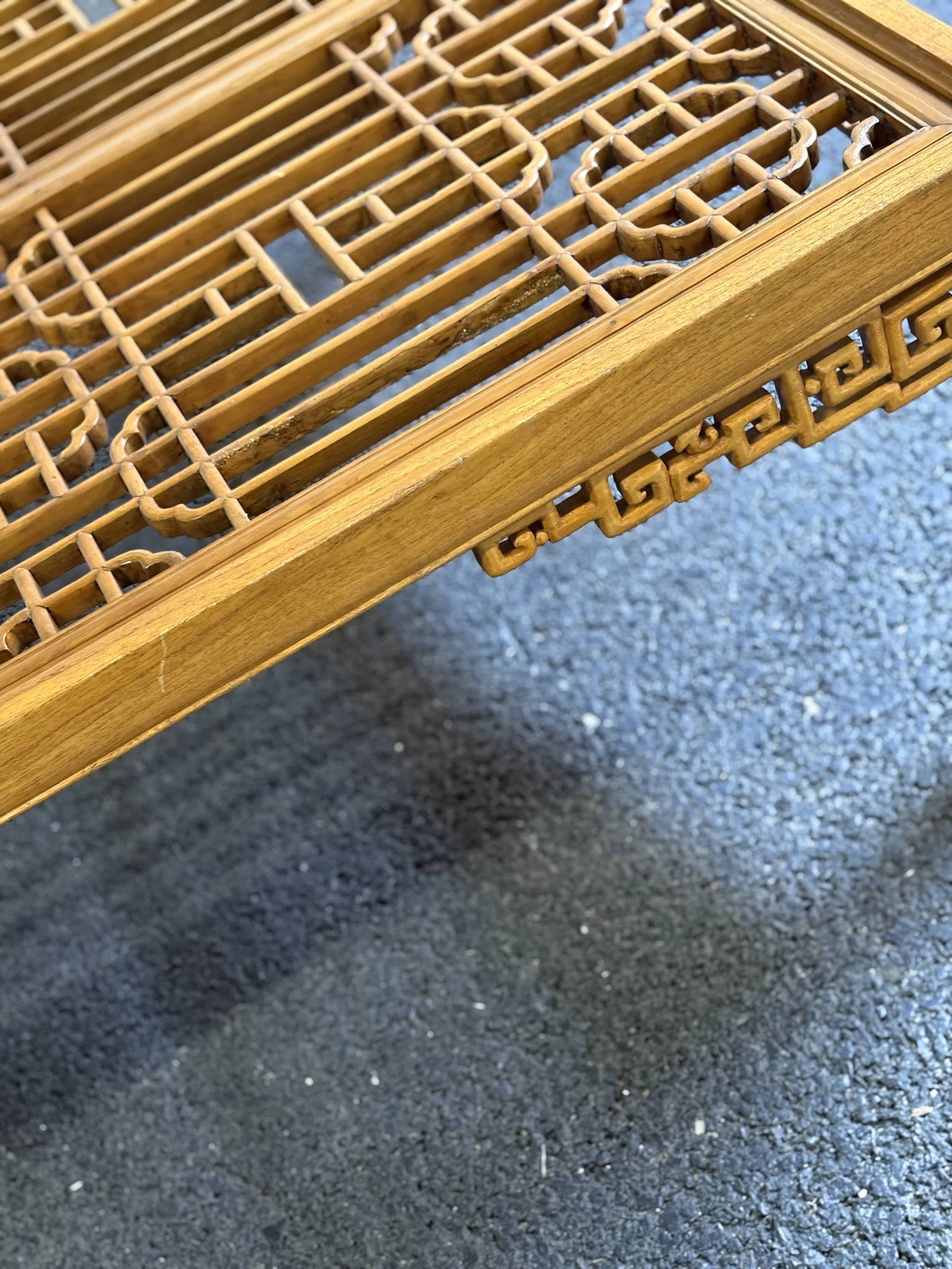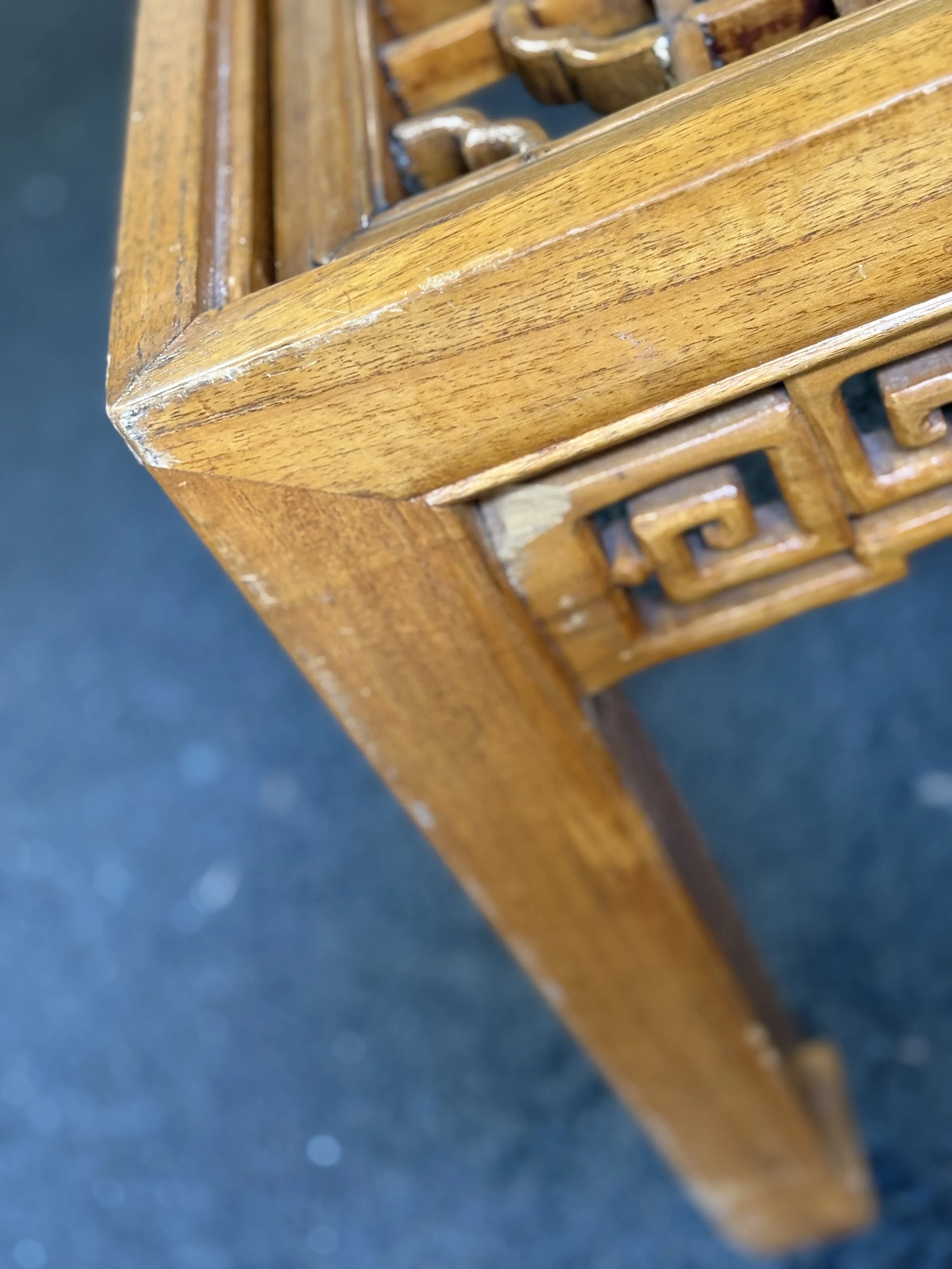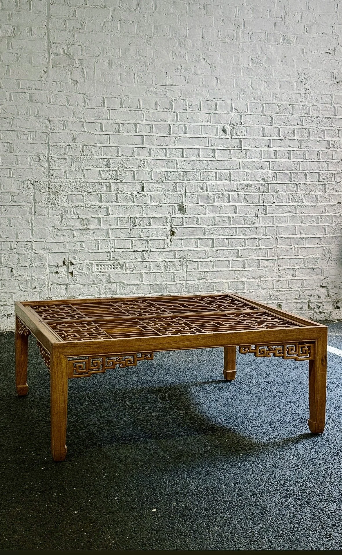 With its intricate craftsmanship and light honey-toned finish, this Chinese elmwood coffee table brings refined detail and architectural elegance. The rectangular (presents as square) top is constructed from two framed panels of open fretwork, each carefully carved to allow light and shadow to play across its surface. While visually light, the table’s structure is solid and thoughtfully balanced, with every line contributing to its overall harmony. A custom glass top could be added for everyday functionality though stacking of trays would be a chic option.